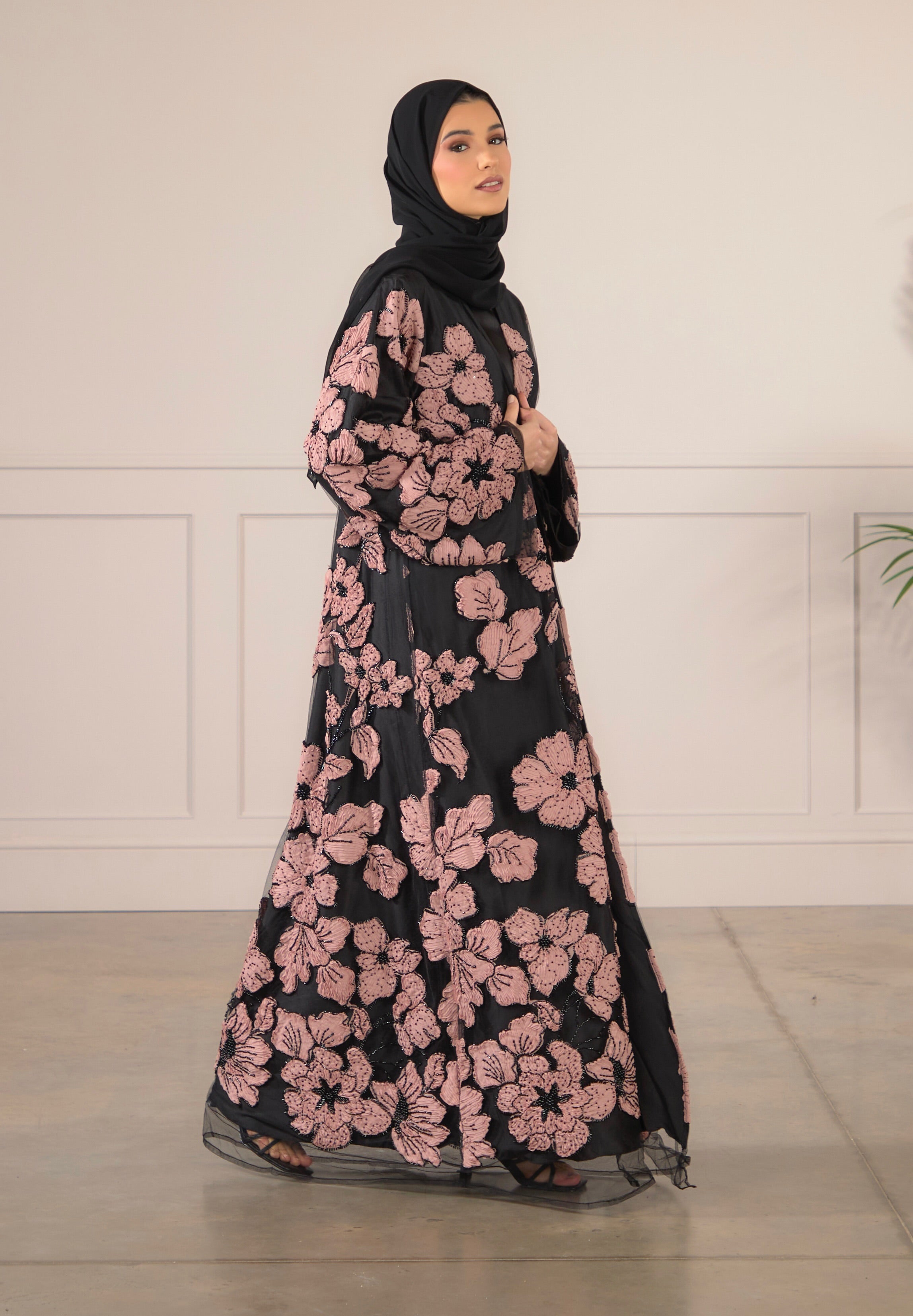 A stunning abaya richly embellished with intricate flower detailing throughout, making it a statement piece perfect for special occasions. Pair...