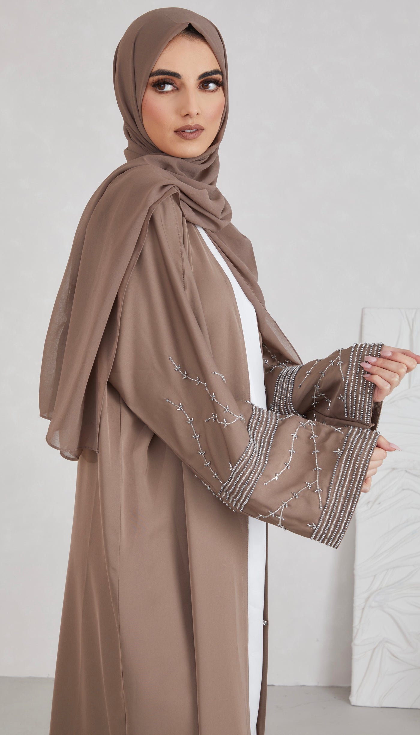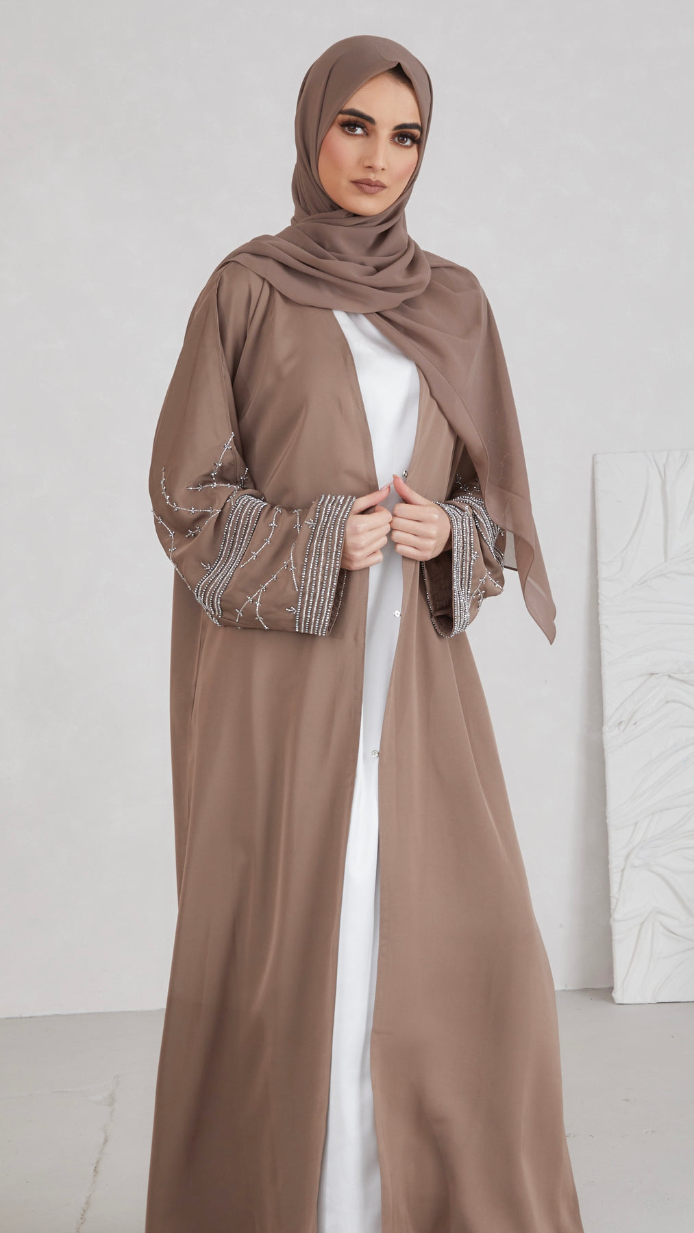 A Mocha open abaya with pretty silver beading details on the sleeves. Can be worn open and styled with an... Read more