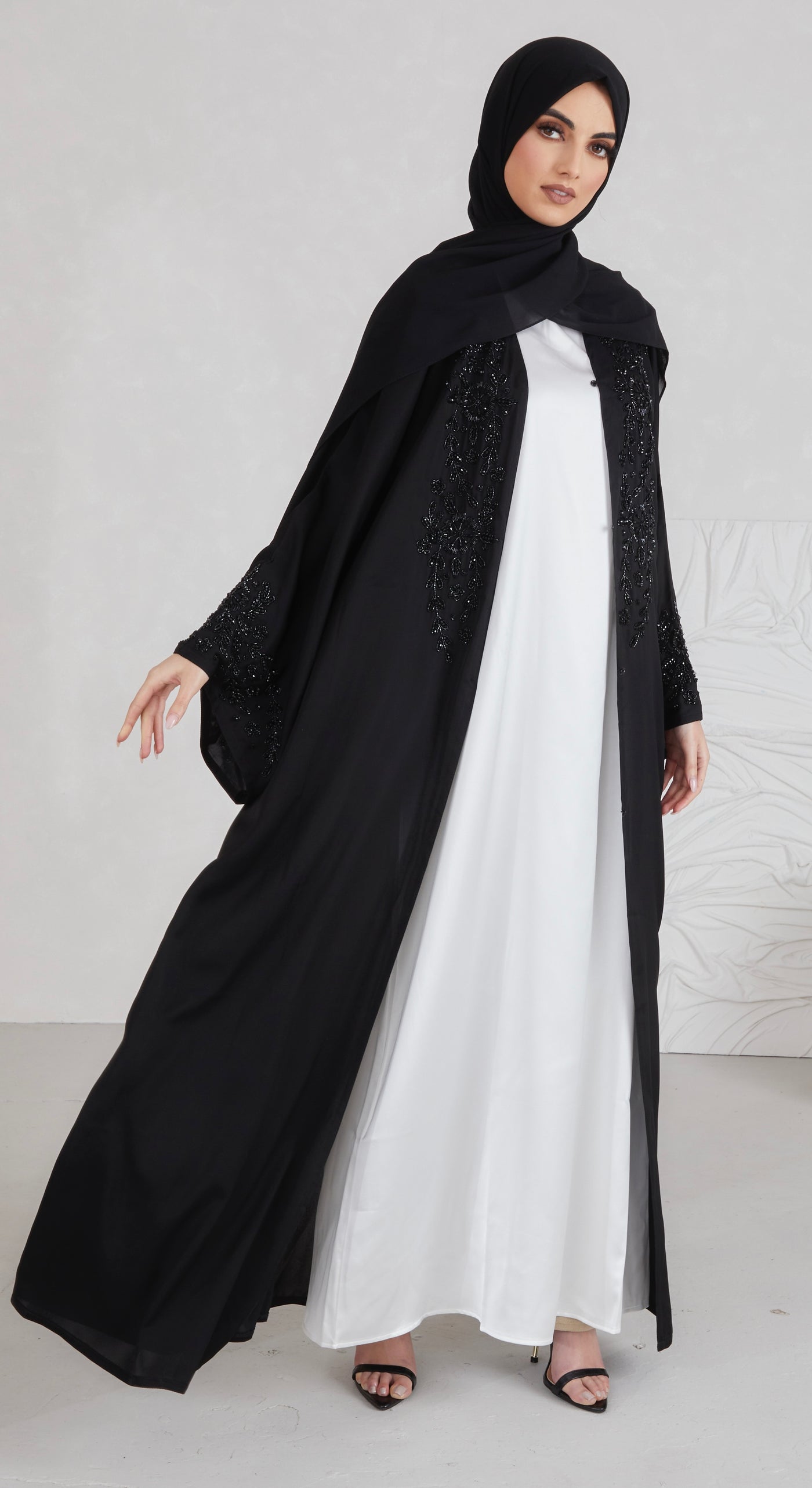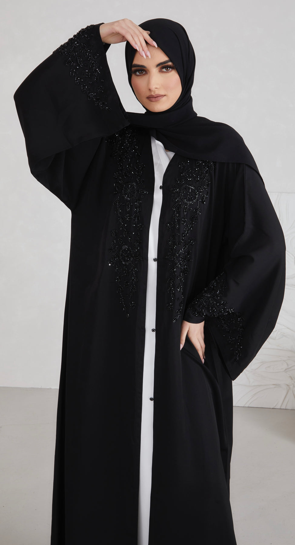 A classic black open abaya with stunning black embellishments. Perfect for special occasions.