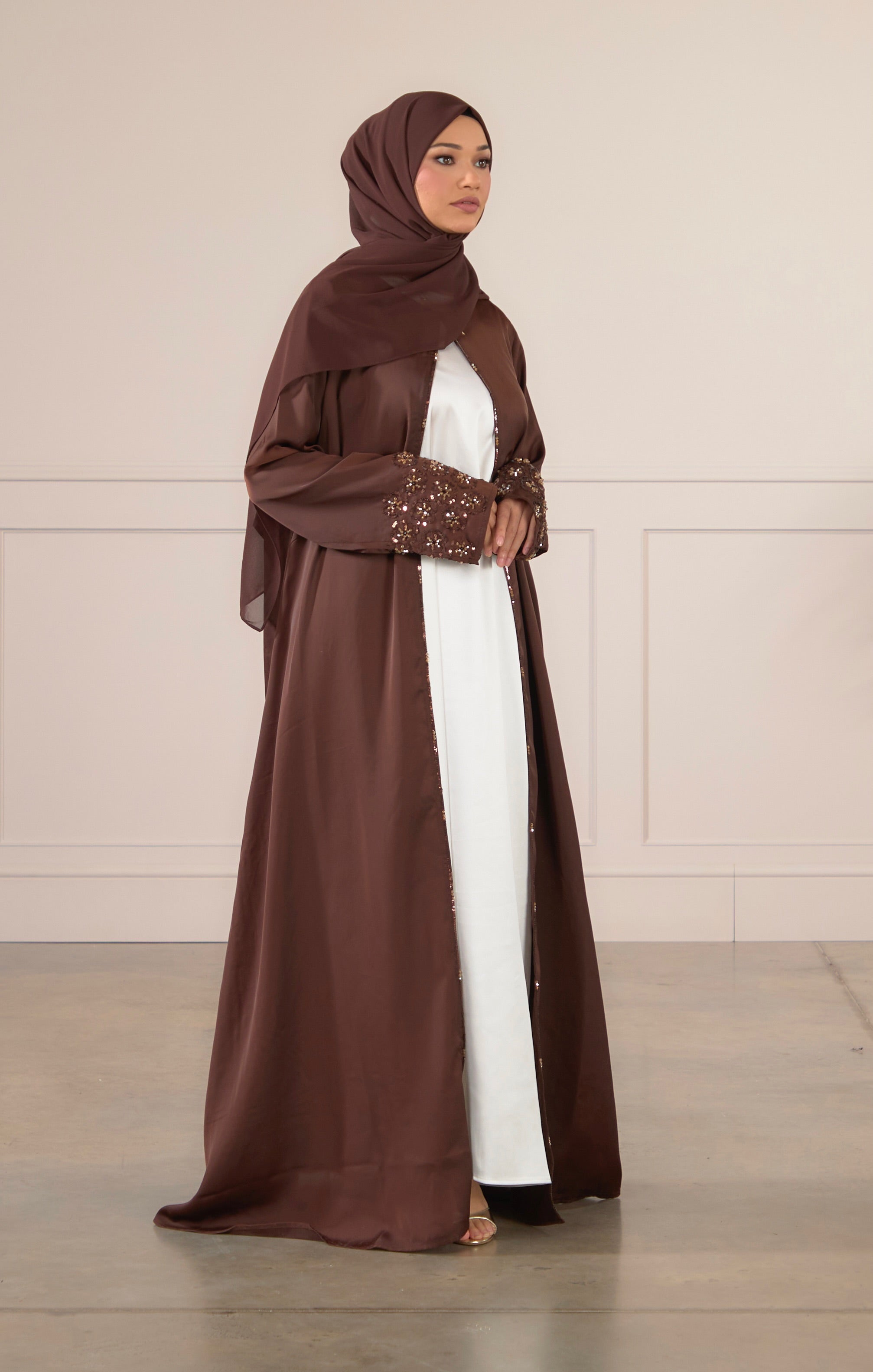 A sleek satin finish abaya designed with delicate floral sequin sleeves, adding a soft touch of elegance and subtle shimmer,...