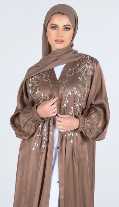 The perfect abaya for your next occasion, a shimmery mocha shade with pretty silver /mocha embellishment. Suitable for UK sizes... Read more