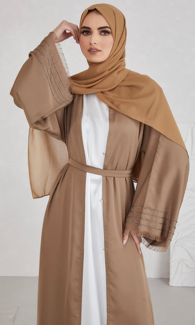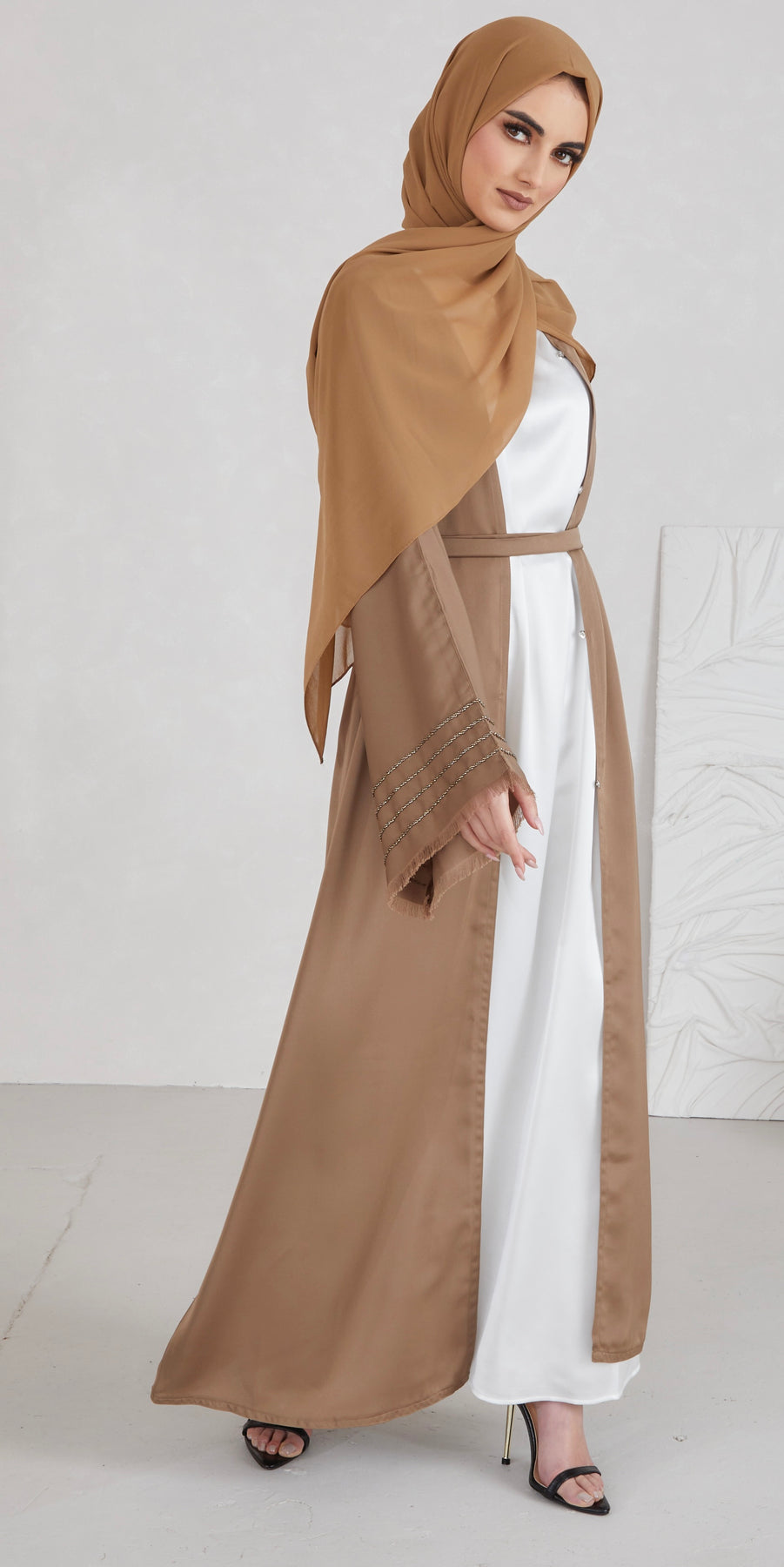A Camel open abaya with beading details on the sleeves and a tassel finish. Can be worn open and styled... Read more
