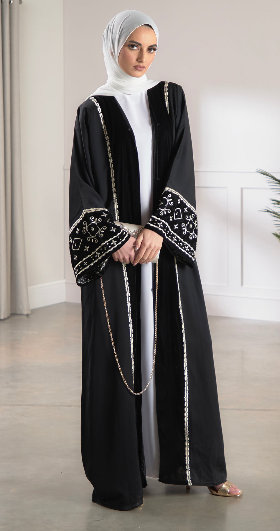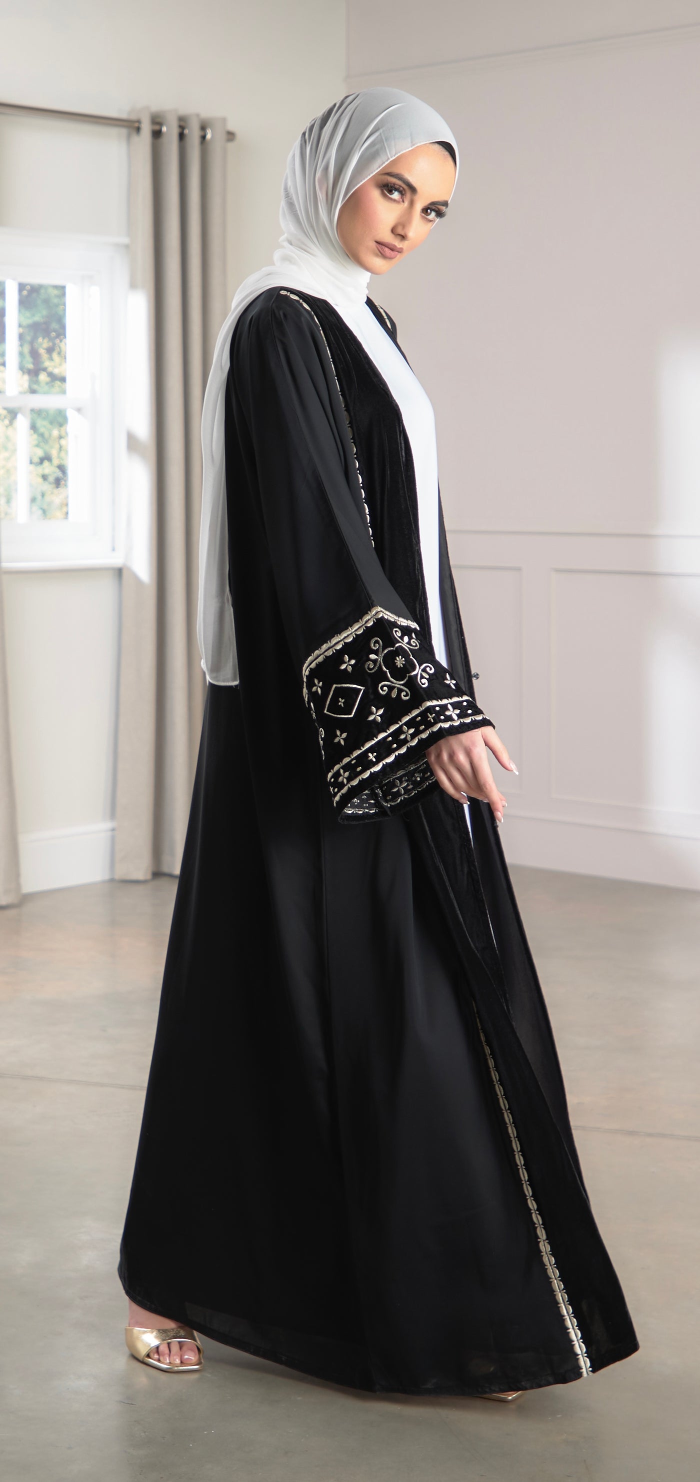 A gorgeous classic black option perfect for special occasions! A nidha abaya with velvet sleeves and bordering with pretty pattern... Read more