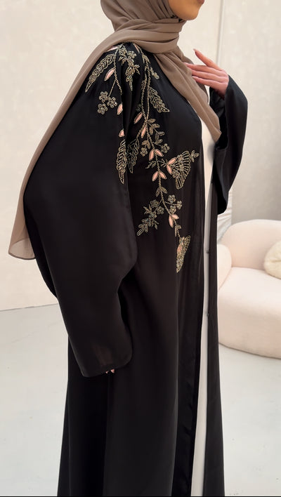 A classic black open abaya with pink and gold floral design bead embellishments. Perfect for special occasions. The product consists... Read more