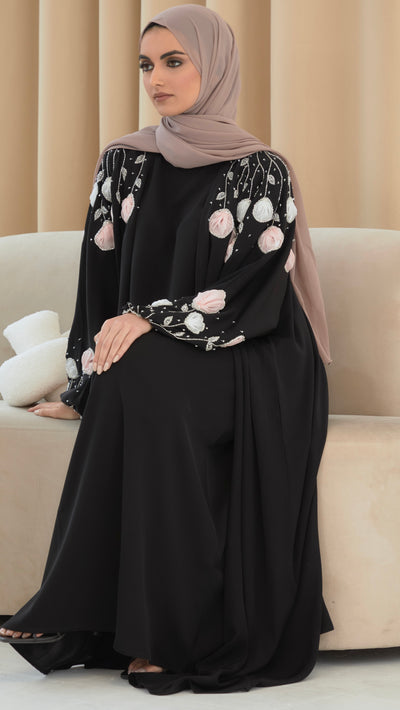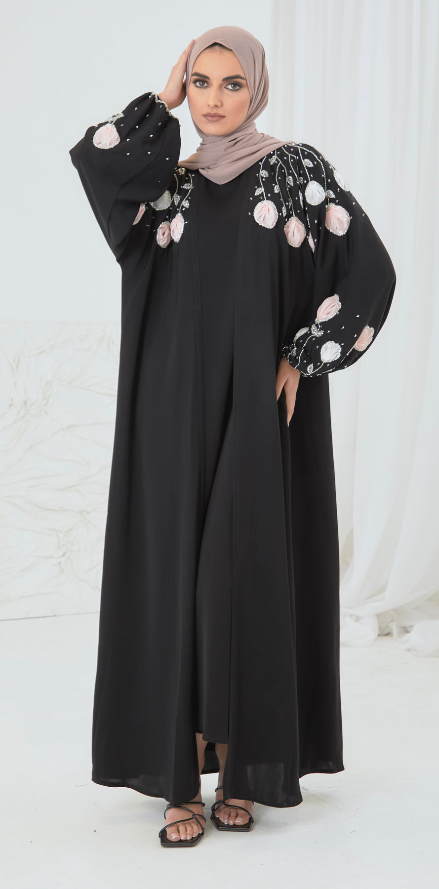 An elegant two piece occasion wear set. A classic black abaya with pretty floral embellishments, coming complete with an inner... Read more