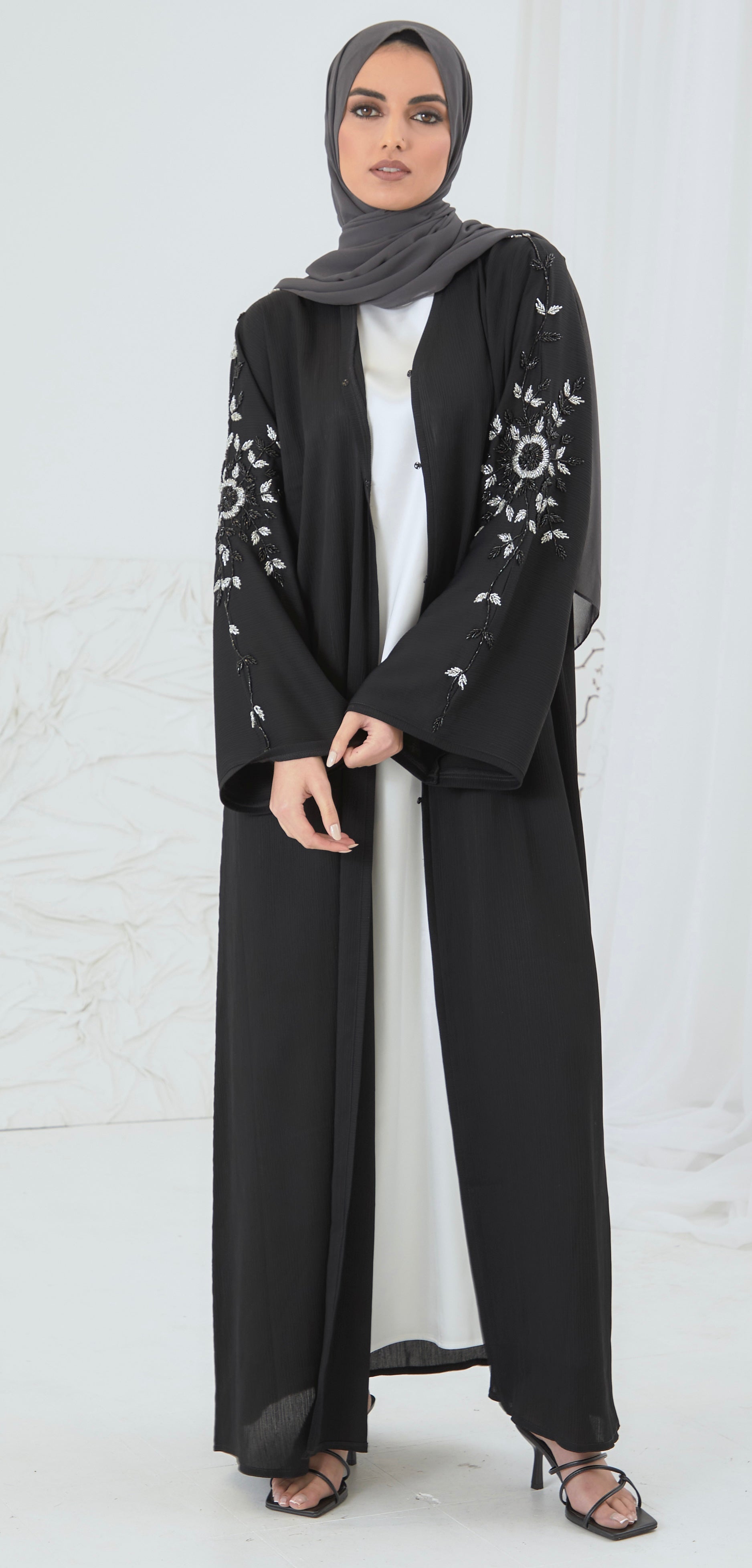 A beautiful black abaya with silver and black embellished sleeves, perfect for special occasions. Comes with a matching belt for... Read more