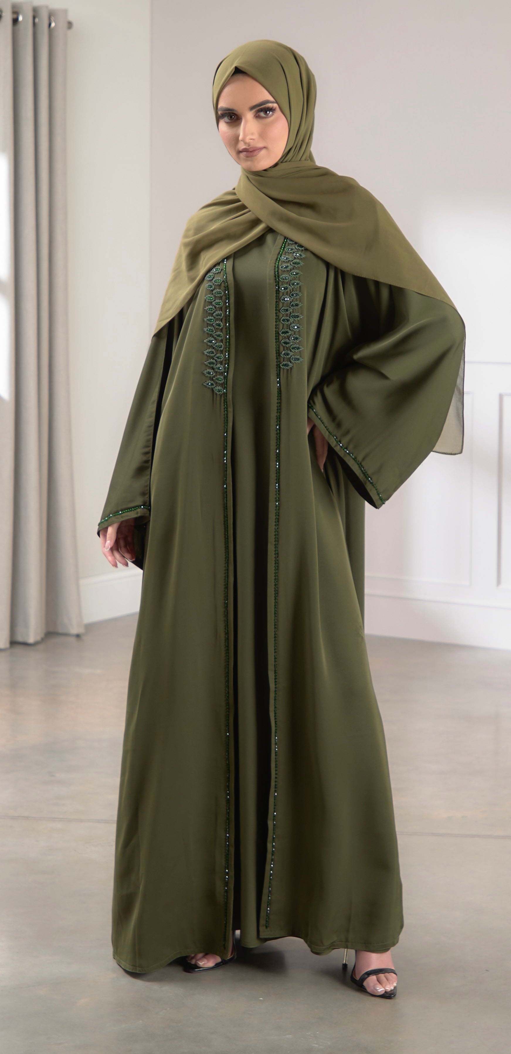 An elegant two piece occasion wear set. A khaki open abaya with pretty embellished bordering, coming complete with a matching... Read more