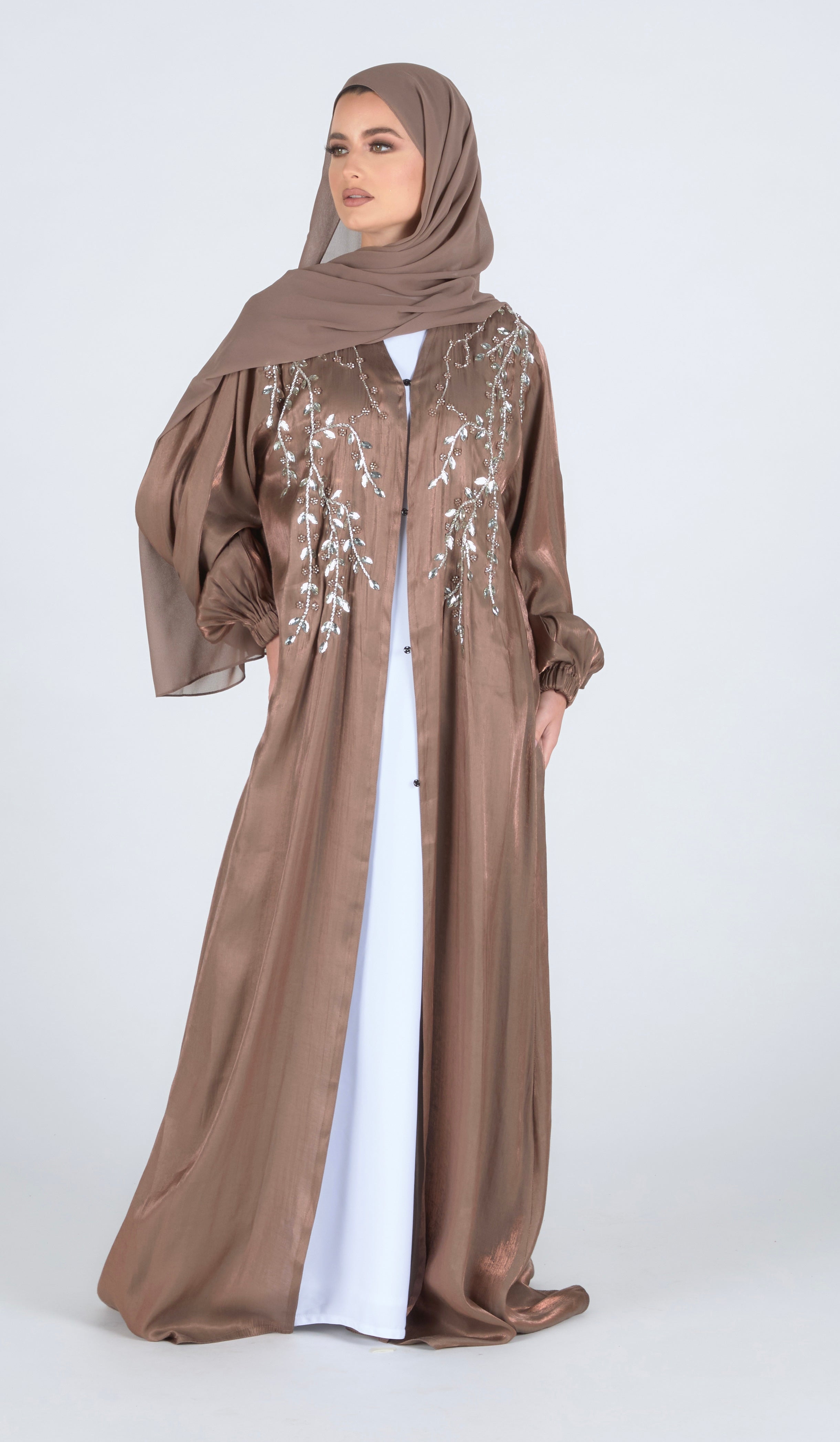 The perfect abaya for your next occasion, a shimmery mocha shade with pretty silver /mocha embellishment. Suitable for UK sizes... Read more