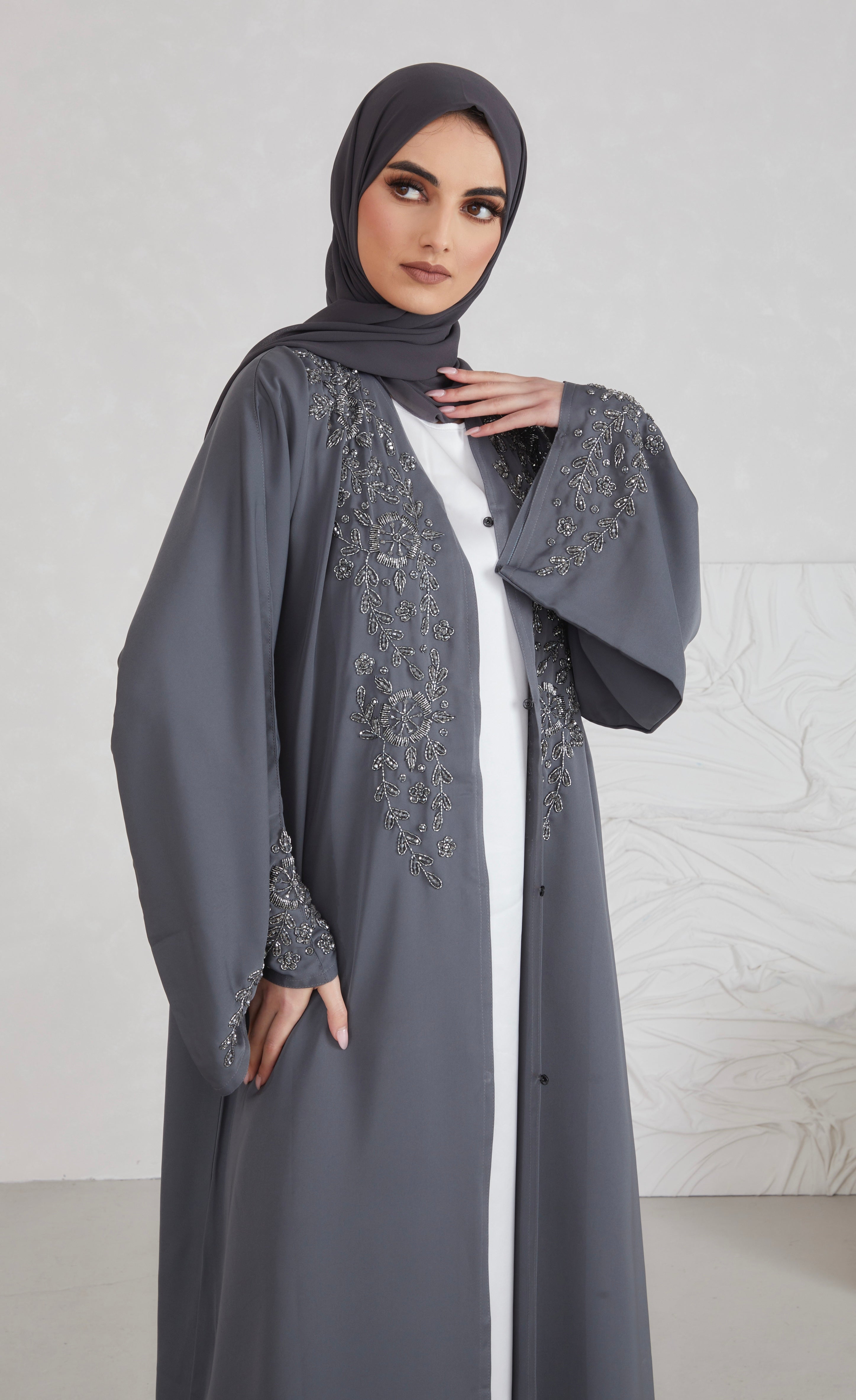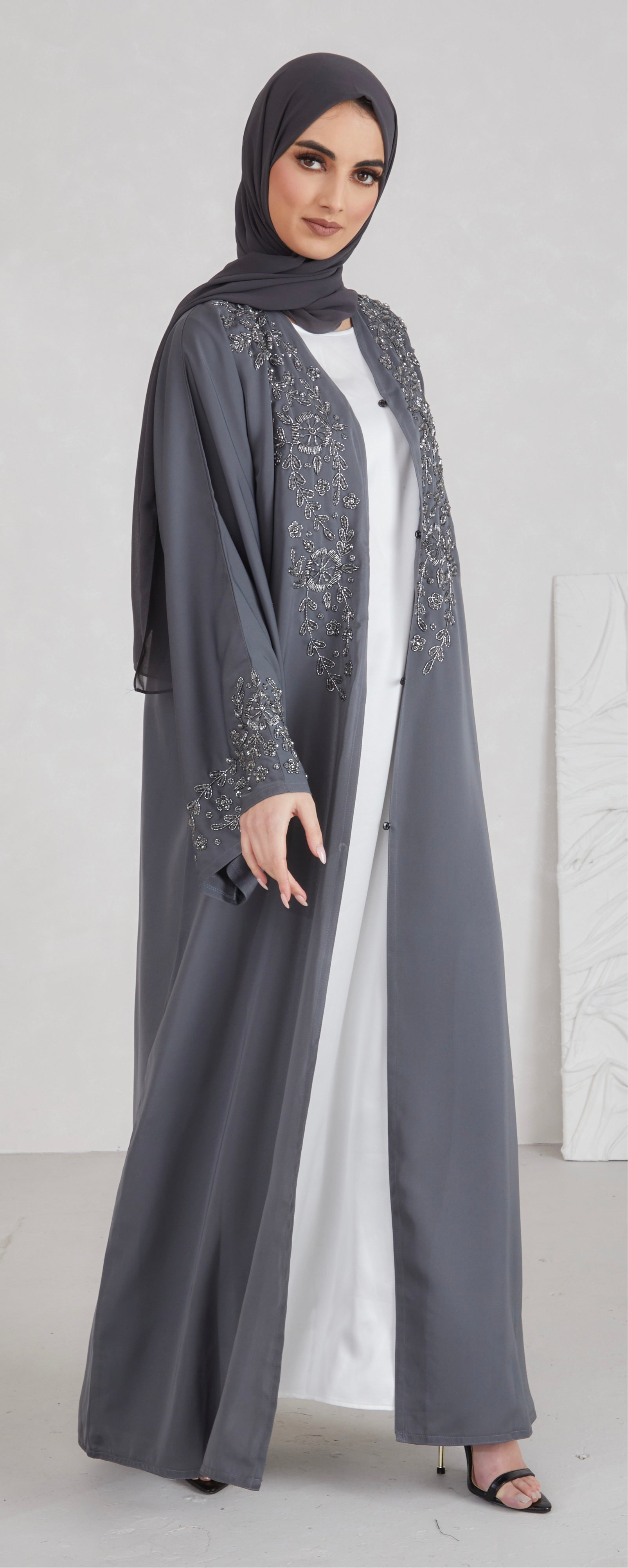 A grey open abaya with stunning floral embellishments. Perfect for special occasions. Comes with a matching belt Suitable for UK... Read more