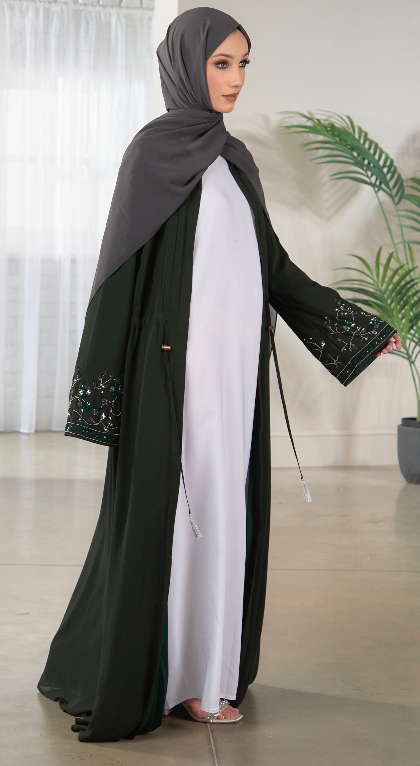 Step into timeless elegance with our embellished sleeve open abaya, a statement piece designed for special occasions.