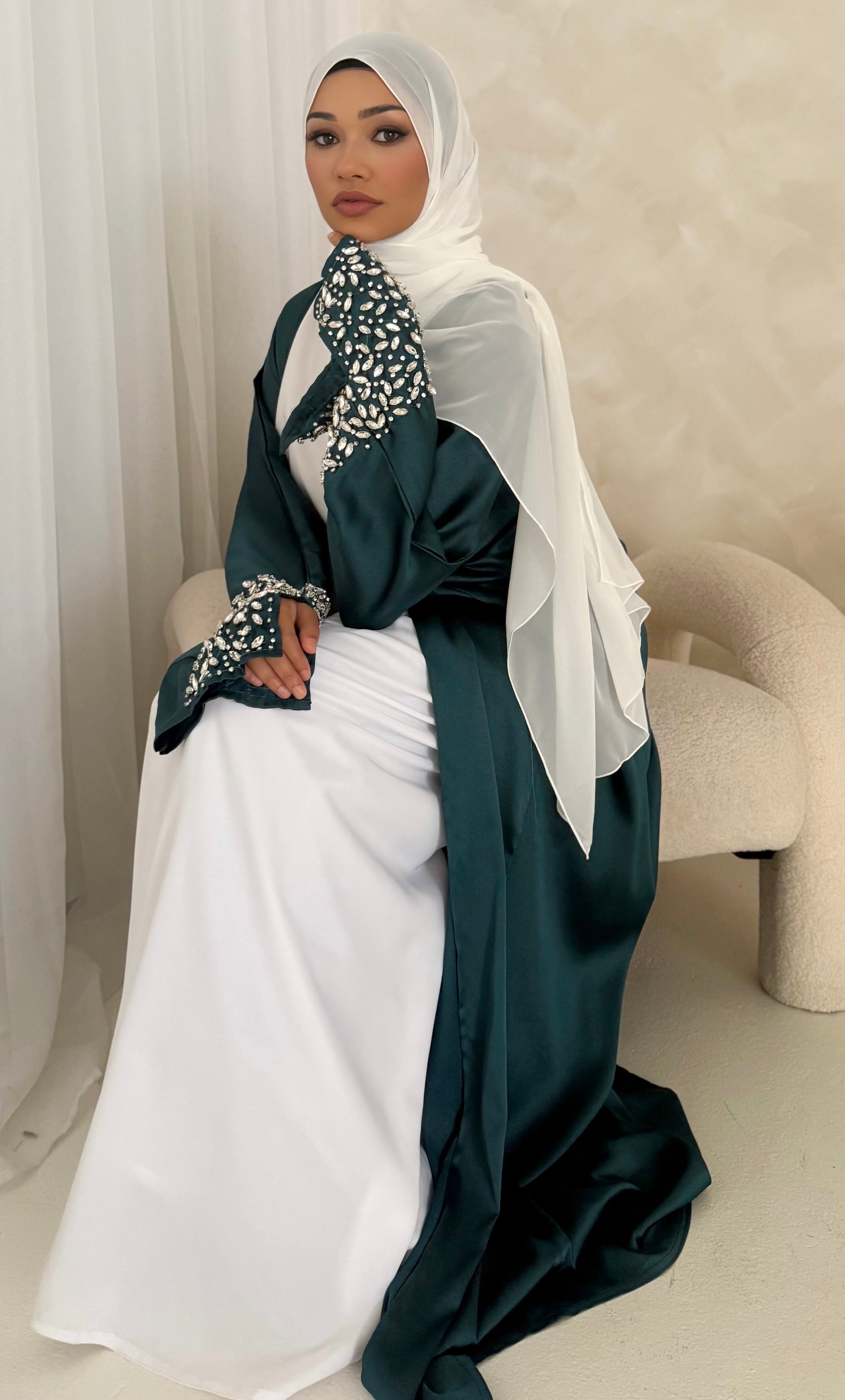 A gorgeous abaya perfect for occasion wear. An open abaya coming complete with a white inner slip dress and a matching hijab to the abaya. The abaya features stunning stone work and a slit feature for added elegance. Also available in Almond.