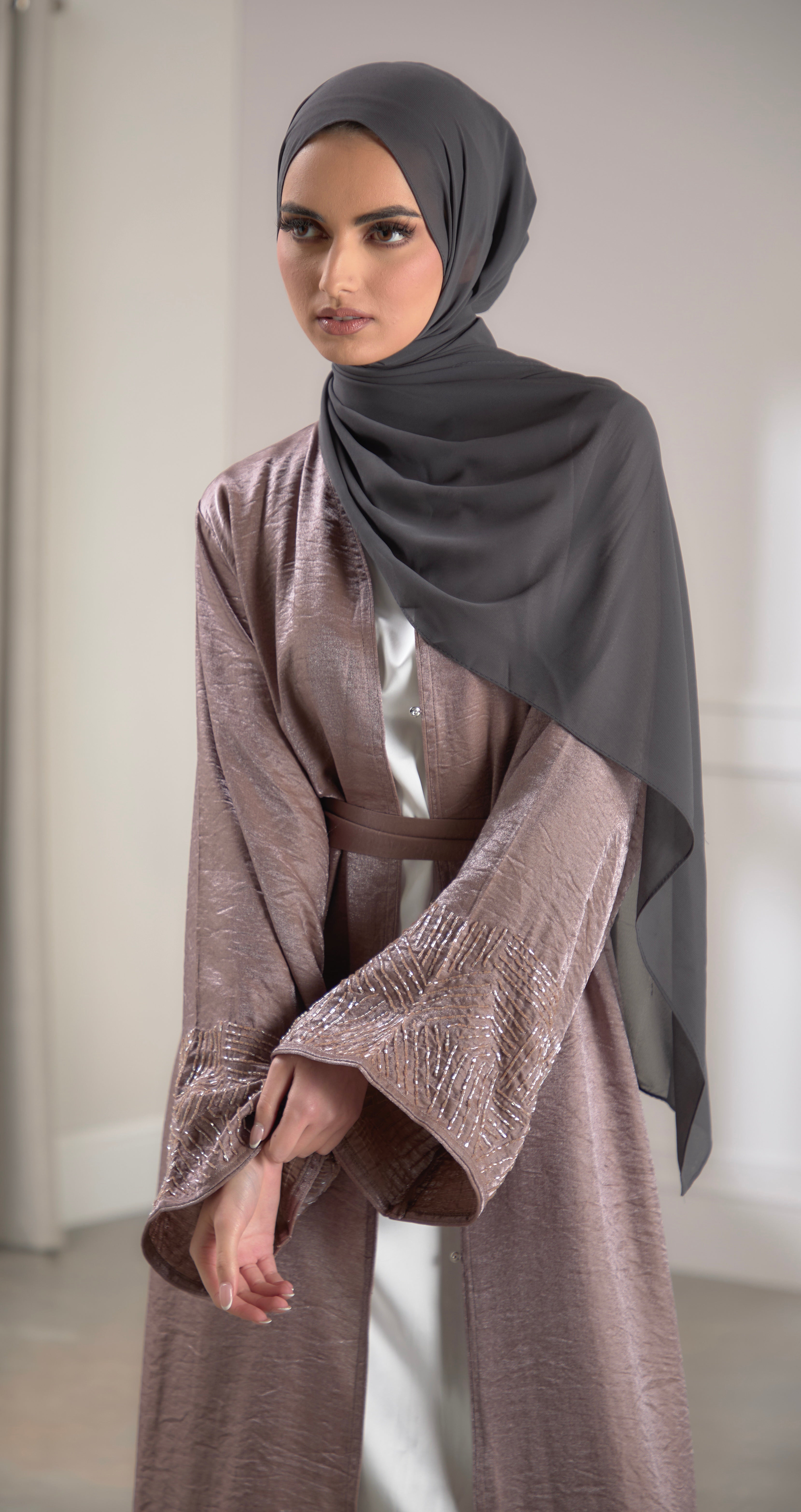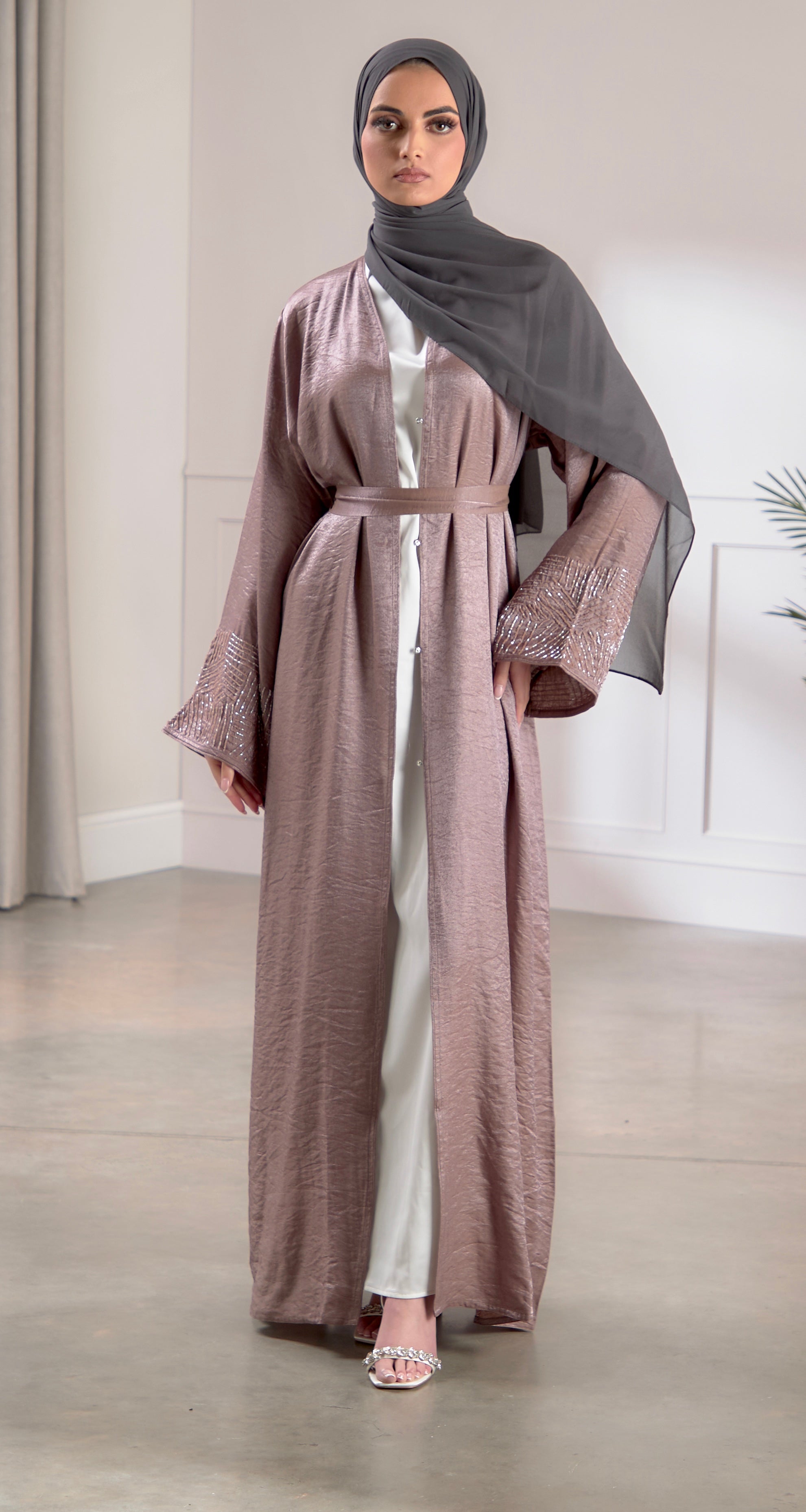 A stunning shimmery mauve abaya with sequin embellished sleeves. Suitable for UK sizes 6-14 Matching belt is included Open with... Read more