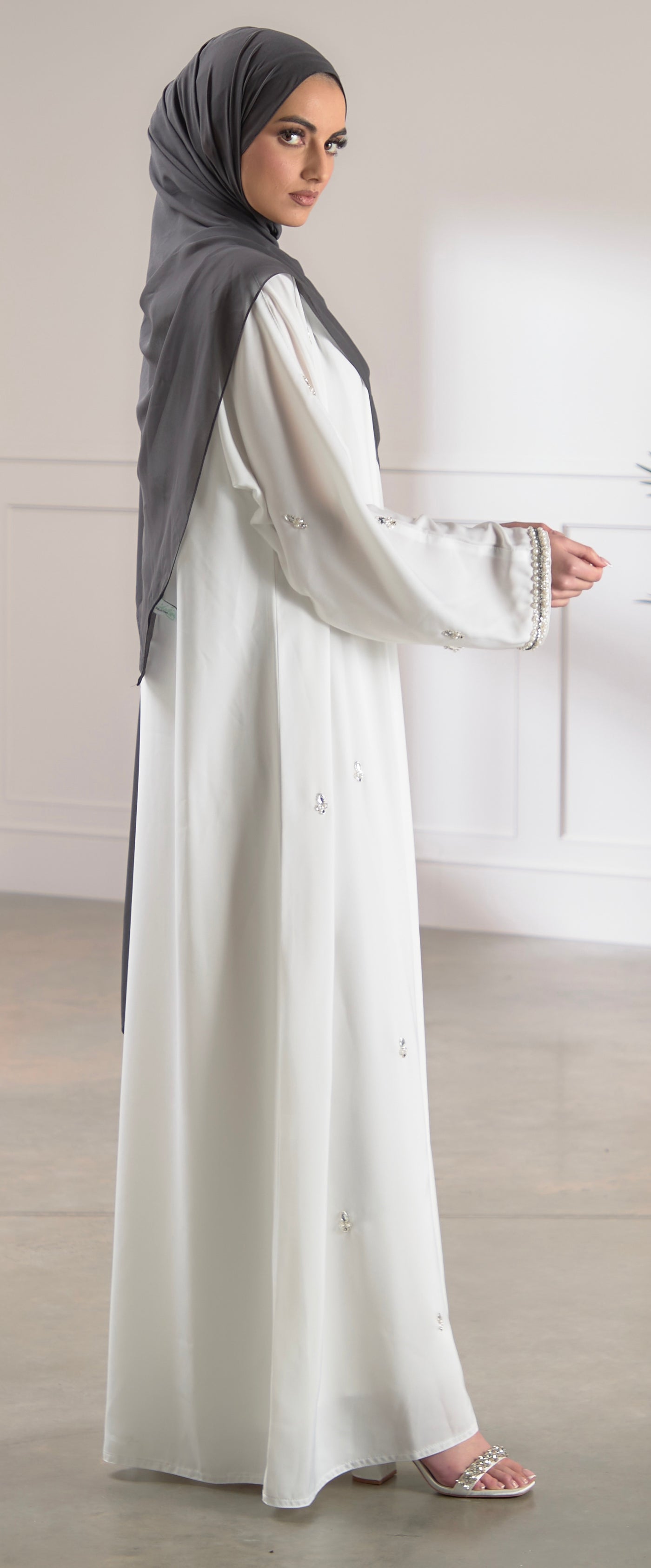 A gorgeous white abaya with pearl bordered sleeves and scattered pearl embellishments! Perfect for special occasions. Pair with our white... Read more